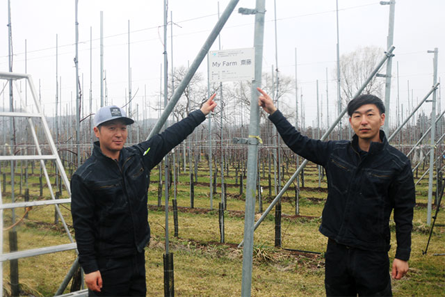弘前市小沢にあるモデル園で行った園地継承式では、弘果総研の葛西社長より独立園地銘板の交付を受け、2人協力して銘板の設置を行い、今後に向けての抱負を語りました。